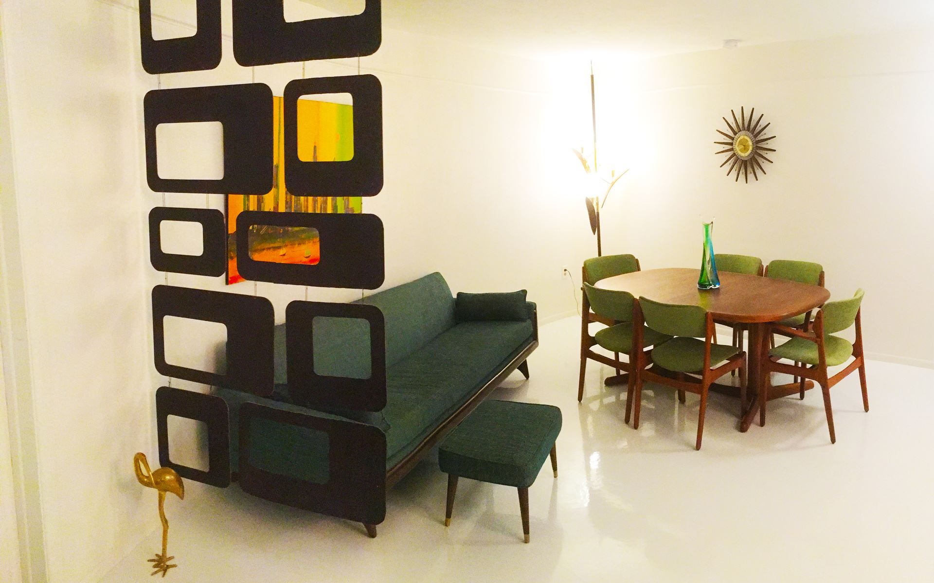 A one-story concrete cylinder with period breeze-blocks stands out immediately upon arrival, and the interior does not disappoint — with vintage furniture, cabinets, lights, furnishings and artwork.